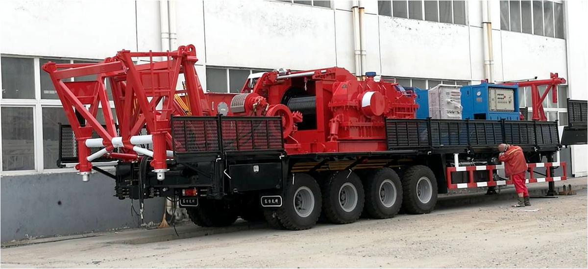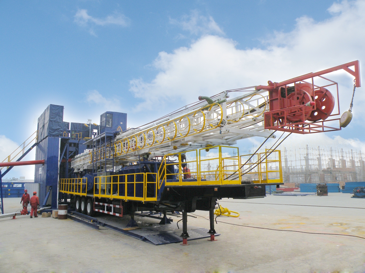 拖裝鉆機(jī)的動力、絞車、井架、游車系統(tǒng)及傳動機(jī)構(gòu)全部裝載于半掛底盤上,移運(yùn)時用牽引車拖掛移運(yùn)至現(xiàn)場,該類產(chǎn)品對于提高鉆井作業(yè)搬遷效率具有很大的優(yōu)勢,而且節(jié)約移運(yùn)資源,適合油區(qū)道路條件較好、井場相對開闊的油田。我公司設(shè)計(jì)制造的1500米、2000米、3000米和4000米鉆深的柴油機(jī)驅(qū)動半掛鉆機(jī)車,其最大靜載荷從1350~2250kN,具有作業(yè)負(fù)荷大、性能可靠、越野能力強(qiáng)、搬遷方便、費(fèi)用低等特點(diǎn),適應(yīng)于中淺井鉆井作業(yè)。
