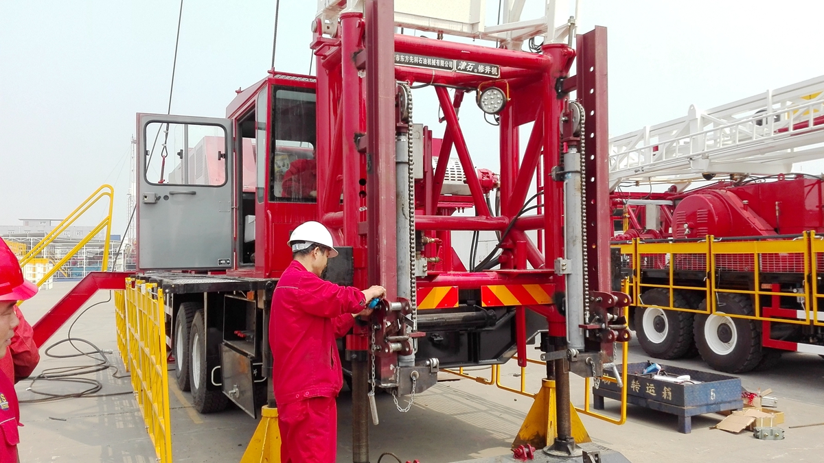 自動升降工作臺是一種主要用于修井作業(yè)過程中操作工人站立工作的平臺。平臺可自動進行升降和翻轉(zhuǎn),工作臺翻轉(zhuǎn)后可隨修井機進行運輸;可滿足從平臺的三個方向上、下管的要求;設(shè)有油污收集裝置,避免油污污染環(huán)境,滿足油田環(huán)保的要求。